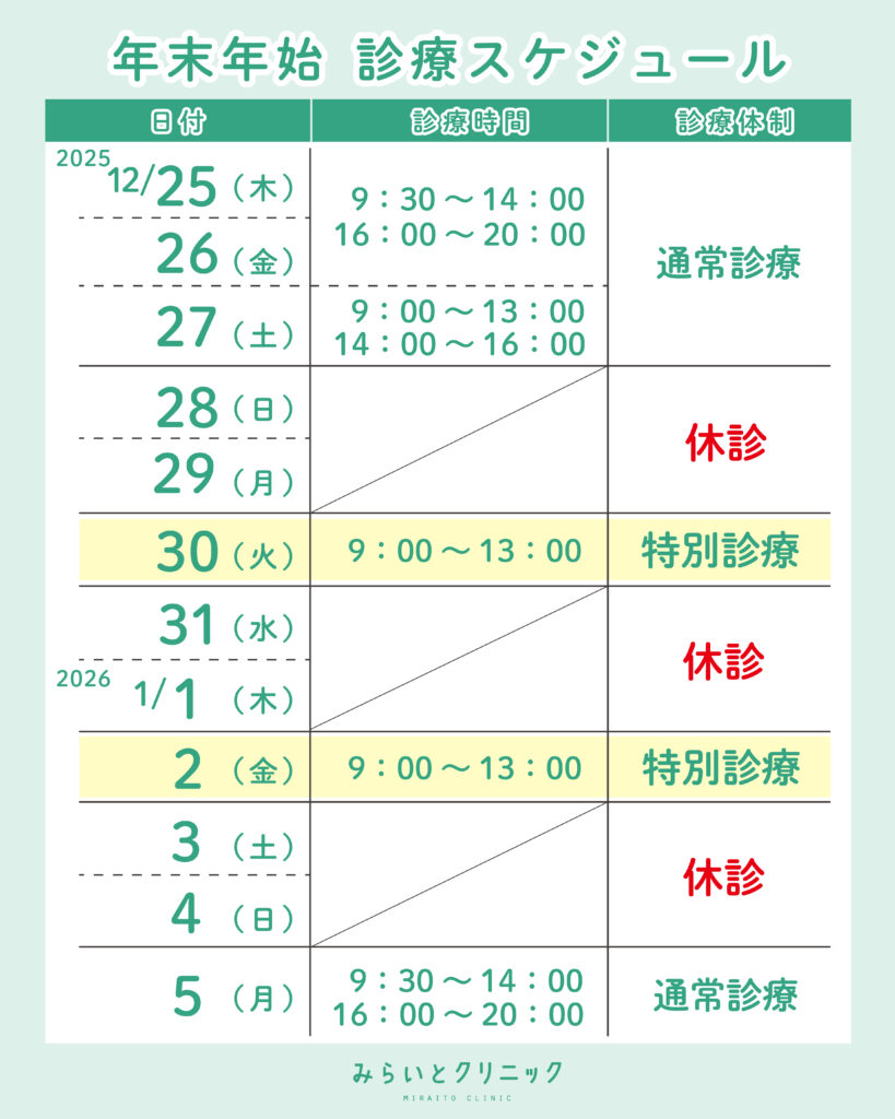 いつもみらいとクリニックをご利用いただきありがとうございます。年末年始の診療スケジュールのお知らせです。