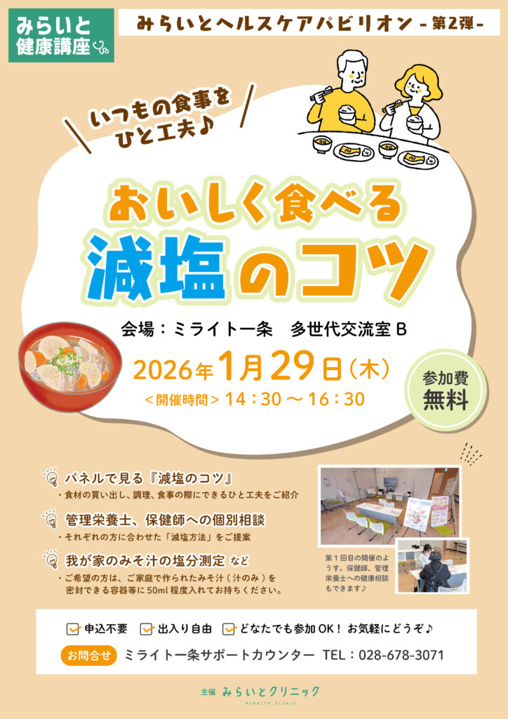【1/29開催】みらいと健康講座のお知らせ『おいしく食べる減塩のコツ』
